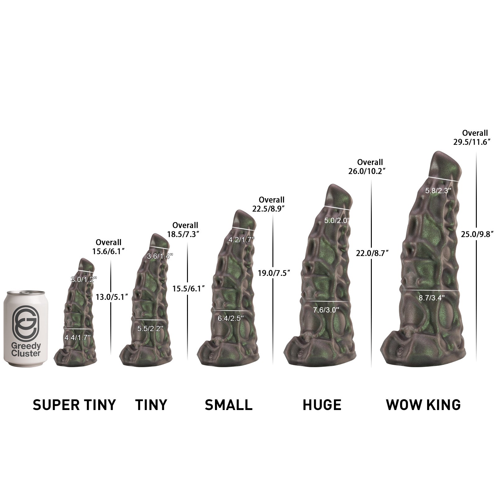 Warrior reads like a relic from an alien ocean — a tapered, trunk-like tip thins into a locking neck that mimics a plug’s hold, then blossoms into a swollen, spindle-shaped midsection for ultimate fullness. The shaft follows a soft, banana curve that naturally hugs internal contours; its surface is covered in irregular, seahorse-scale channels and cross-hatched prism ridges with scattered raised nodules for unpredictable friction. Instead of a testicle base, Warrior uses a wide, eggless flange integrated with GreedyCluster’s Uni-Suction Cup for low-profile stability and powerful anchoring. Creaturely, tactile, and visually striking — Warrior feels as if a deep-sea xenomorph met seahorse armor and birthed a toy.
